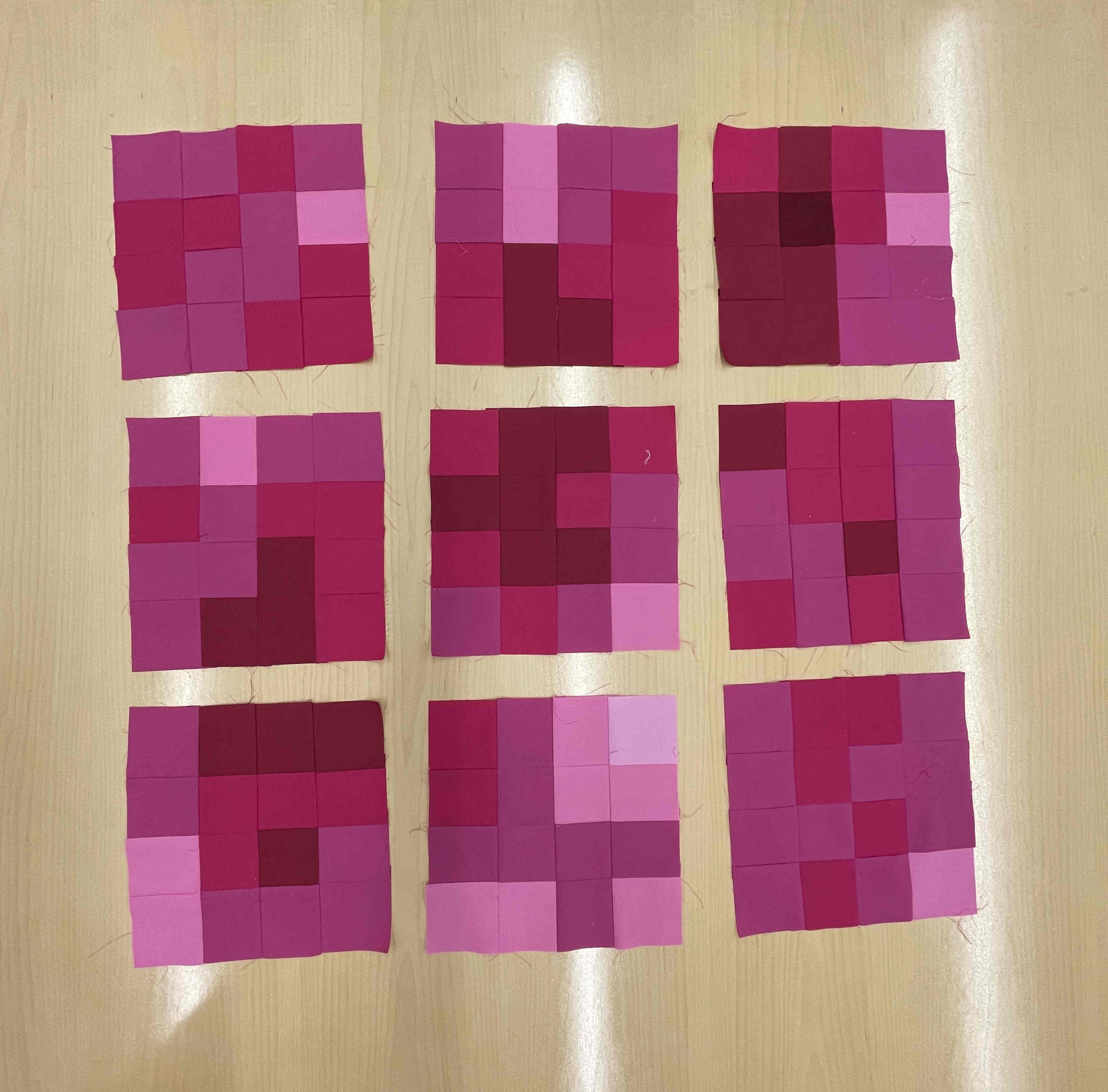 The image I created was a 12x12 grid. Using tools I had, it would be the most straightforward to cut 3.5" squares. Each square would have a 0.5" seam allowance on all sides, so the final quilt would measure to 30"x30". I wasn't sure if this would look too small when it was on display in the MakerLAB.