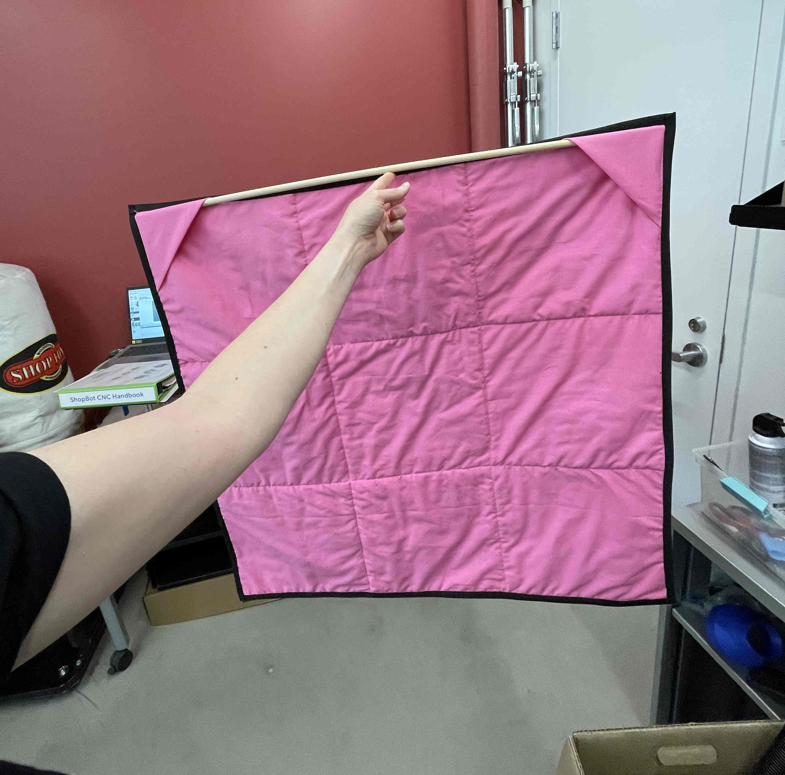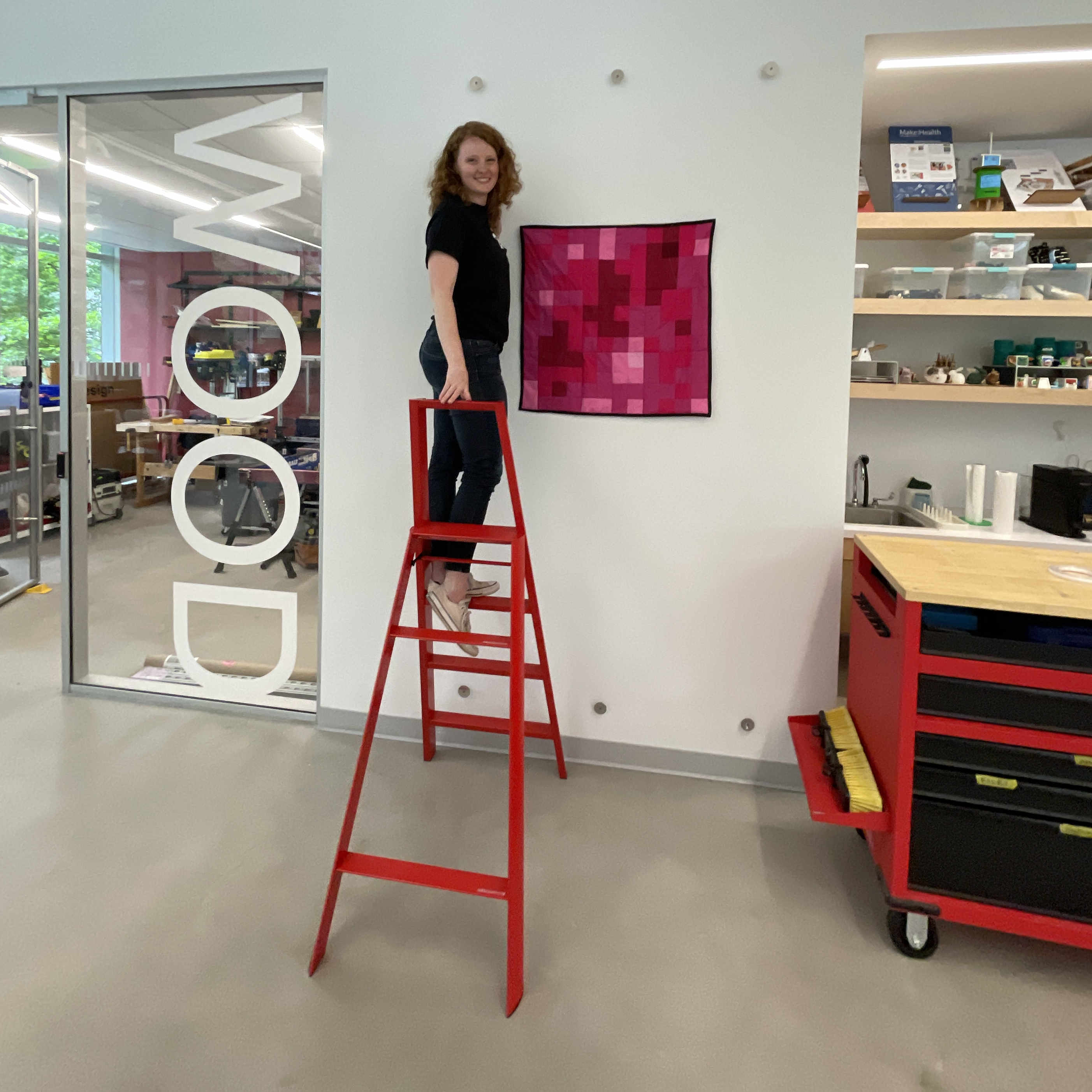 I made two envelopes across the back. We found a dowel rod when moving furniture in the old maker lab, and I cut it to the size of the quilt. It provides some structure while the quilt is hanging