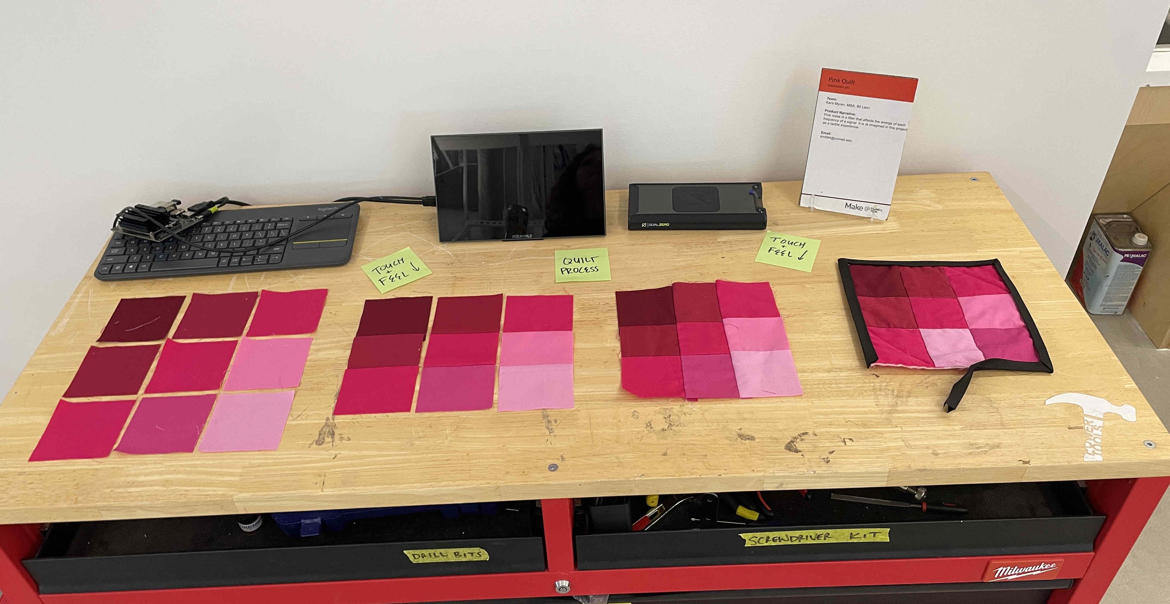 Below the quilt display I added demo pieces so that viewers could learn about the process and physically interact with the art.