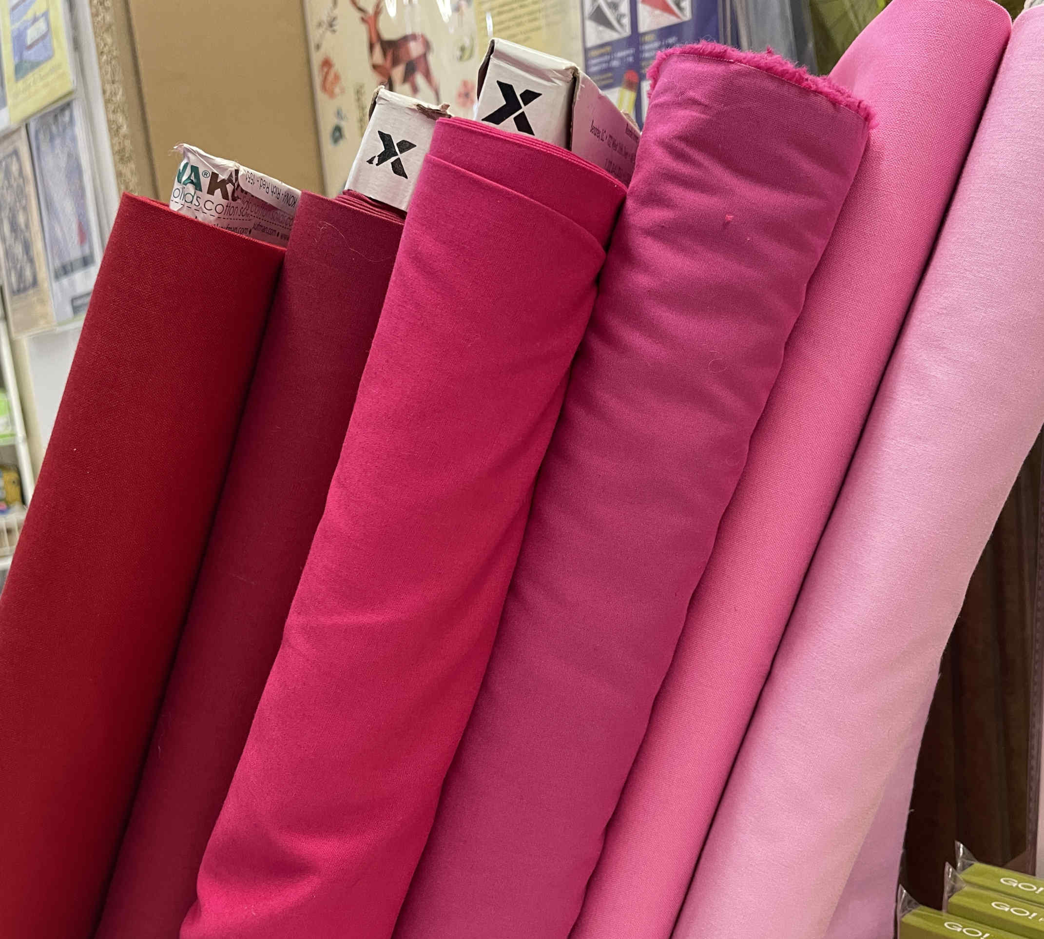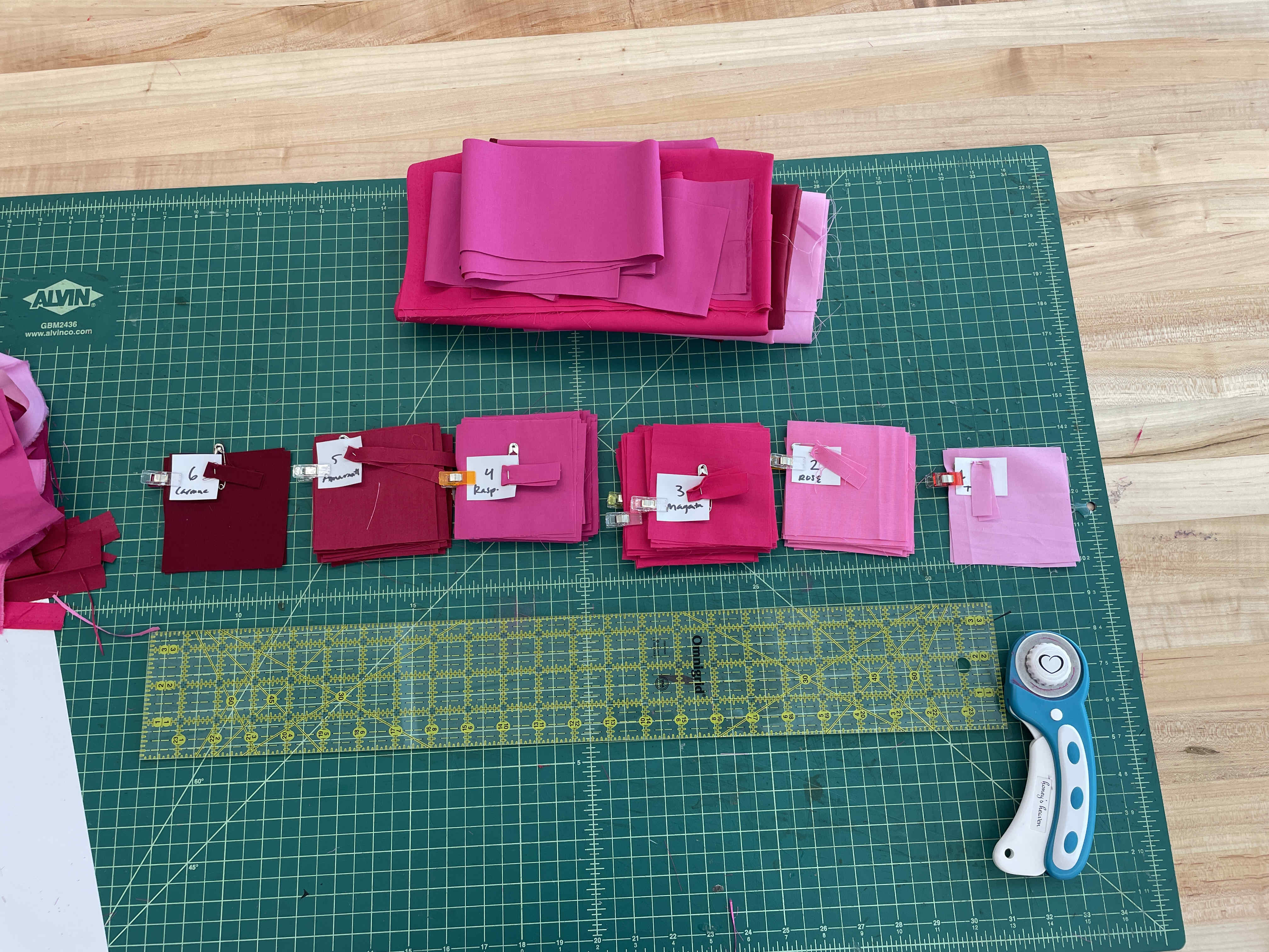 The math that 10 squares = 3.5" of fabric to purchase. This let me know that a half yard of each would probably be enough, but I rounded up to a full yard for the larger colors to account for any mistakes. Because I had extra fabric, I was able to make some small demo pieces as well.