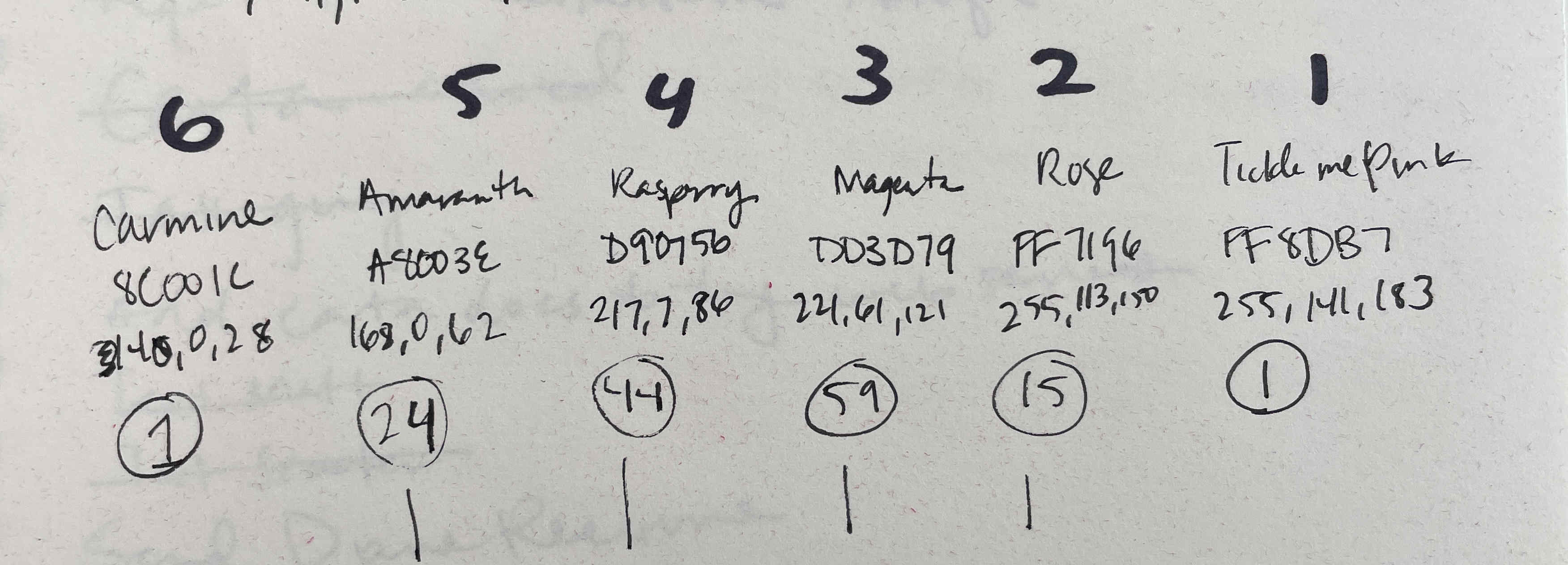 Handwrote my own cheat sheet to move between fabric name, hex code, RGB, and my own 1-6 numbering system.