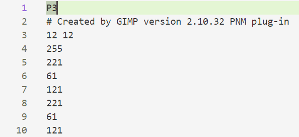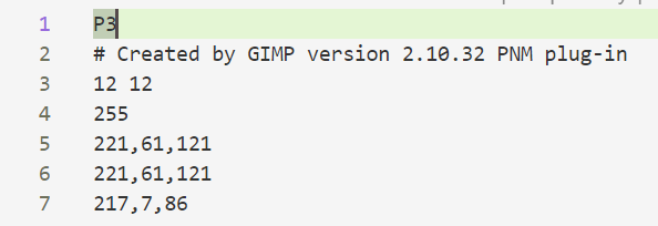 The tiny image was exported to a .ppm, which I opened in VS Code. The file is 436 lines long, and a sample of it is here. Lines 1 and 2 are header information, line 3 specifies that the image is 12x12 pixels, line 4 specifies that the color range is capped at 255, and every line after that is one component of R, G, and B for each pixel.
