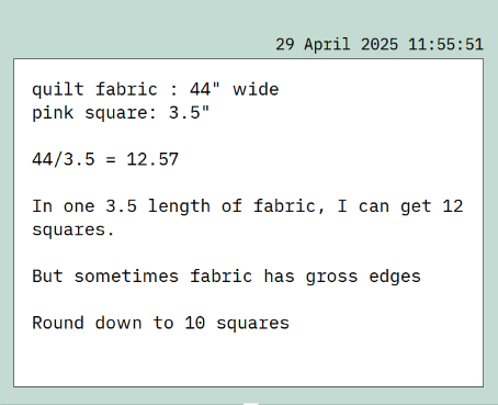 Now that I know how many squares of each color are needed, I need to calculate how many squares can be made in a fabric.